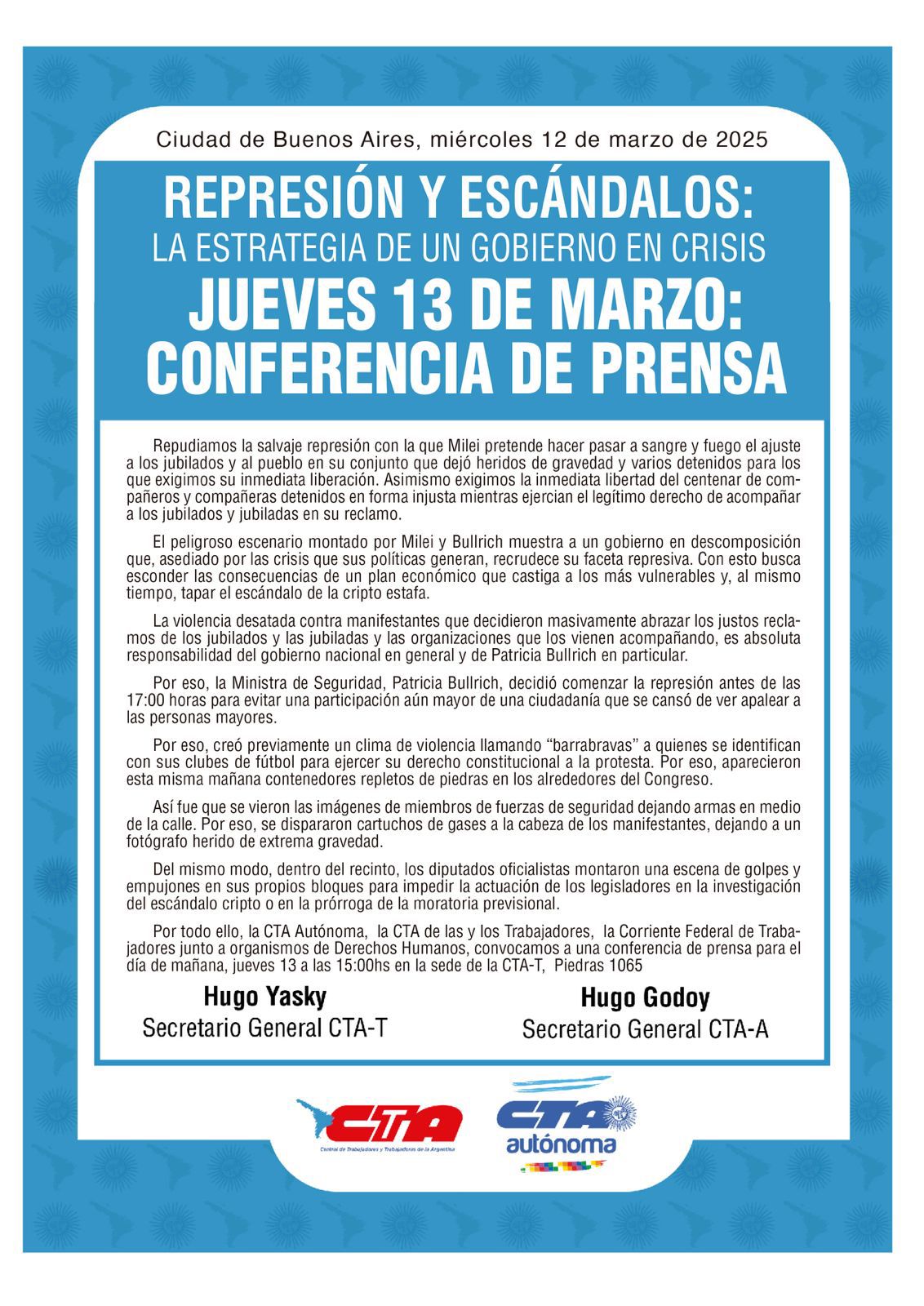 La Central de Trabajadores de la Argentina (CTA) y la CTA Autónoma emitieron un comunicado conjunto repudiando la violencia desatada por el gobierno y acusando a Javier Milei y Patricia Bullrich de utilizar la represión como estrategia para ocultar las consecuencias de sus políticas económicas y el escándalo de estafas con criptomonedas.