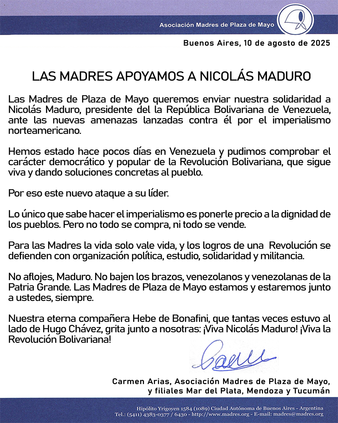 La Asociación Madres de Plaza de Mayo, reconocida organización de derechos humanos argentina, emitió un contundente comunicado donde expresa su solidaridad con el presidente venezolano Nicolás Maduro ante las amenazas del imperialismo norteamericano, reafirmando su respaldo a la Revolución Bolivariana y sus logros sociales y políticos.