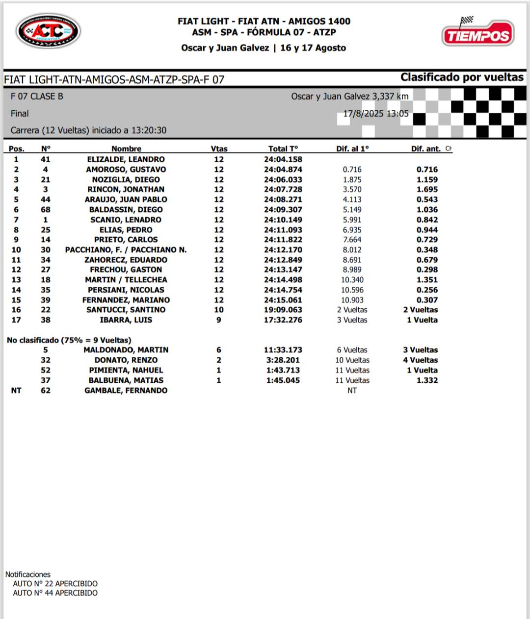 Elizalde tomó la punta y no la soltó más, estableciendo diferencias que lo tranquilizaron en la punta, terminado con Auto de Seguridad por incidencias de carrera y acompañado en el podio por Gustavo Amoroso, de enorme tarea y buscando el triunfo, y por Diego Noziglia, que logra otro podio y se afianza en la categoría.