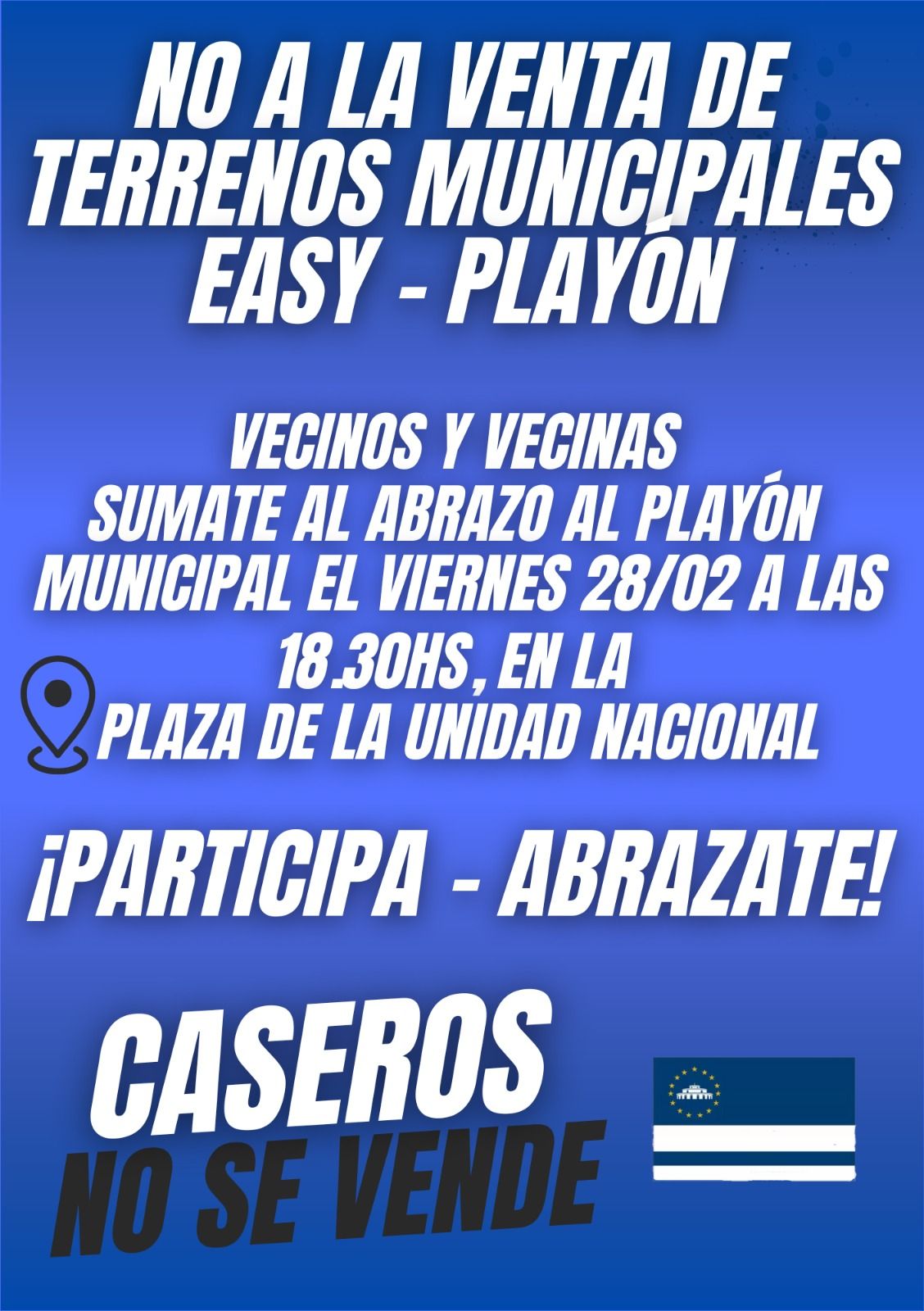 Mañana, a las 18:30, se realizará una manifestación en la Plaza de La Unidad, ubicada a metros de la Municipalidad de Caseros, en protesta contra la ordenanza que permite la venta de terrenos públicos a privados. La convocatoria incluye un abrazo simbólico al playón municipal, como muestra de rechazo a la medida.