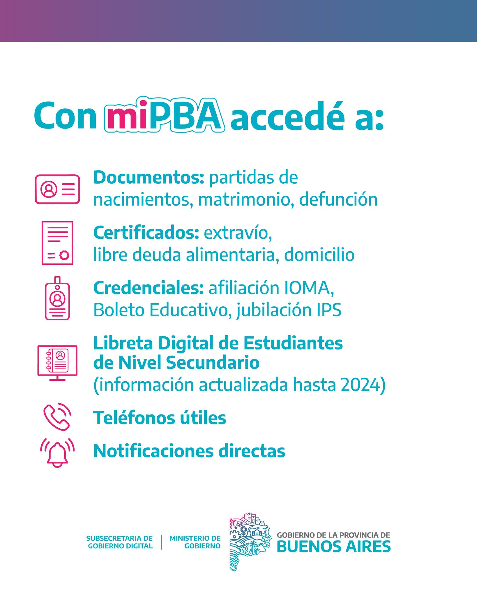 La app Mi PBA tiene el objetivo de centralizar y simplificar el acceso a servicios digitales esenciales para quienes residen en la provincia. Entre sus principales funcionalidades, se destacan: