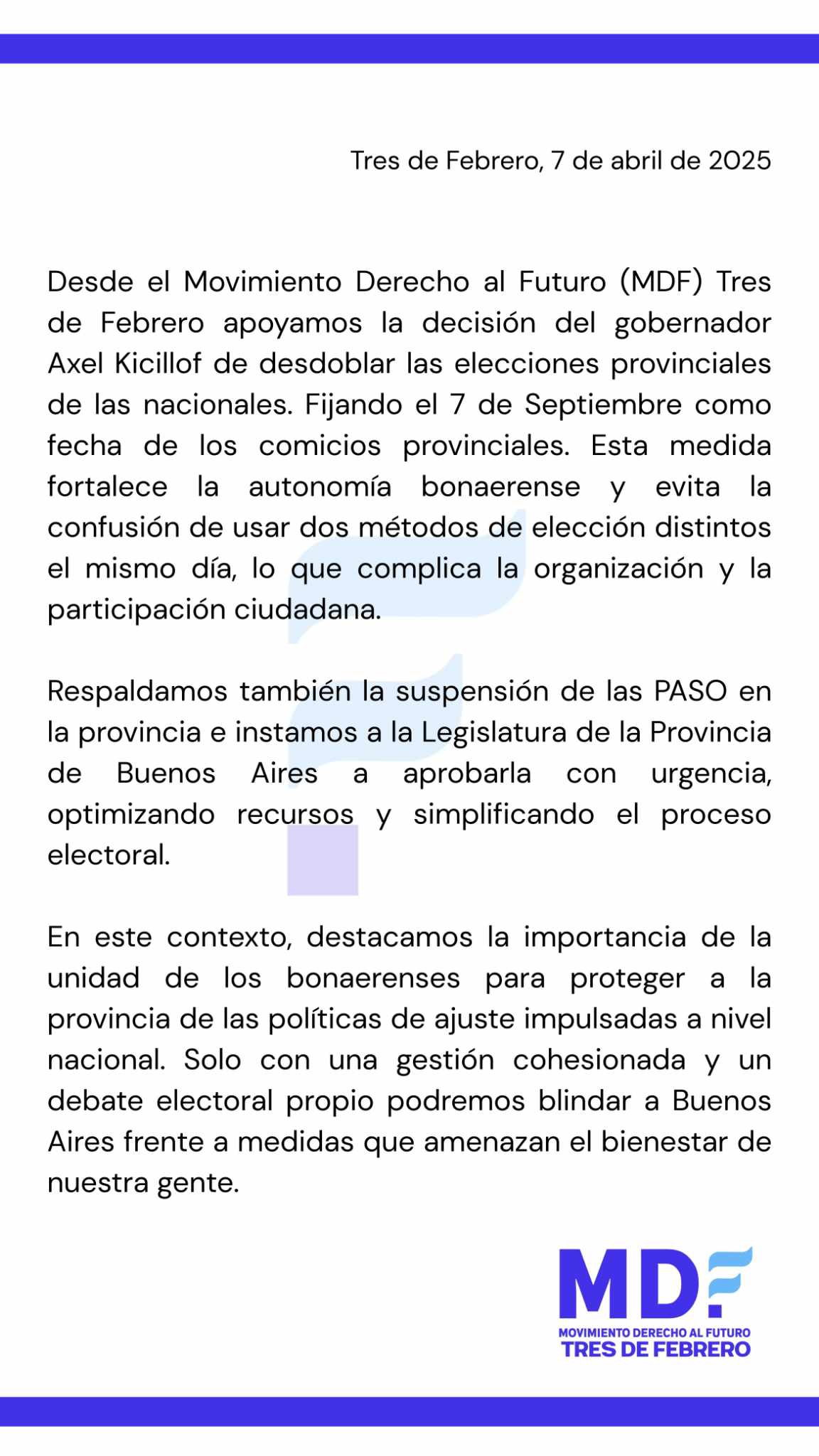 En un comunicado reciente, el Movimiento Derecho al Futuro de Tres de Febrero expresó su respaldo a la decisión del gobernador Axel Kicillof de desdoblar las elecciones en la provincia de Buenos Aires.