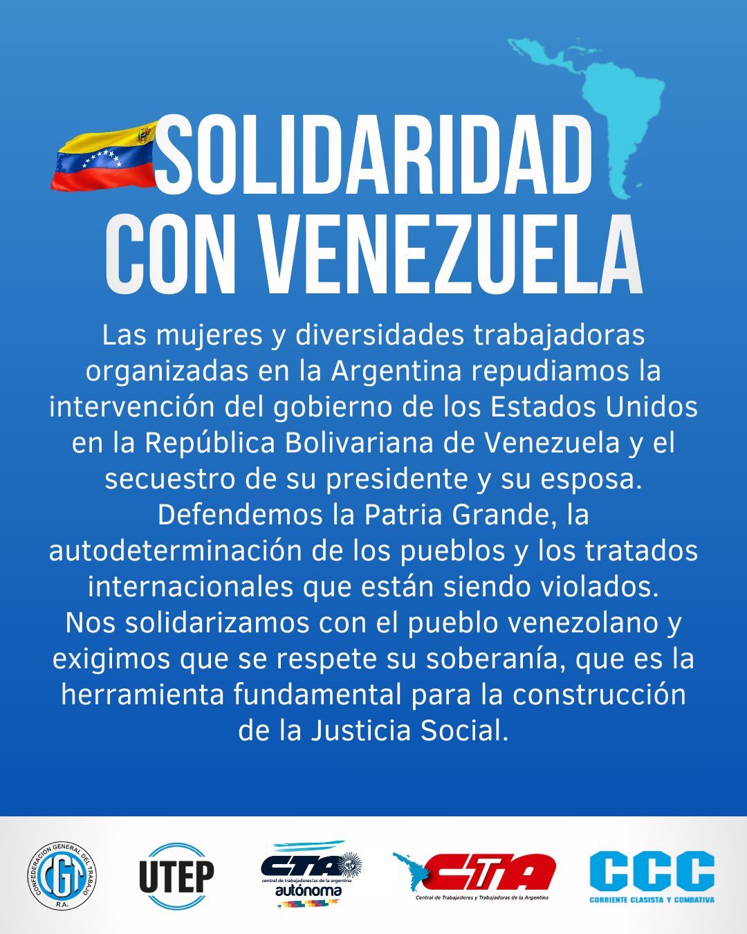 «Las mujeres y diversidades trabajadoras organizadas en la Argentina repudiamos la intervención del gobierno de los Estados Unidos en la República Bolivariana de Venezuela y el secuestro de su presidente y su esposa», reza el comunicado, que invoca la unidad por «nuestra América Morena» y la defensa de la Patria Grande frente a tratados internacionales violados.