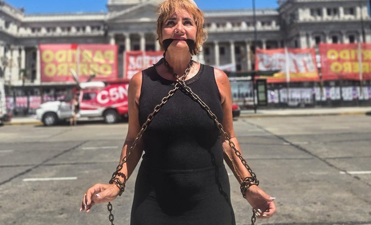 La conductora de Inteligencia Artesanal por C5NNancy Pazos, se encadenó y amordazó frente al Congreso de la Nación en rechazo a la reforma laboral. «Este Gobierno quiere que haya alcahuetes», señaló, tras formar parte de una acción como presidenta del colectivo Periodistas Argentinas en contra de la eliminación del estatuto del periodista, incluído en el proyecto de ley que este miércoles buscará la media sanción en el Senado de la Nación.
