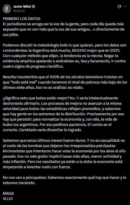“Podemos discutir la metodología todo lo que quieran, pero los datos son contundentes: la Argentina está mucho, MUCHO mejor que en 2023. Con cualquier método que elijan, la tendencia es la misma. Negar la evidencia empírica apelando a anécdotas es, lisa y llanamente, ir contra cuatro siglos de progreso científico. Resulta insostenible que el 100% de los zócalos televisivos insistan en que “todo está mal” cuando tenemos el nivel de pobreza más bajo de los últimos siete años. Eso no es análisis: es relato”, planteó el mandatario en su cuenta de X.