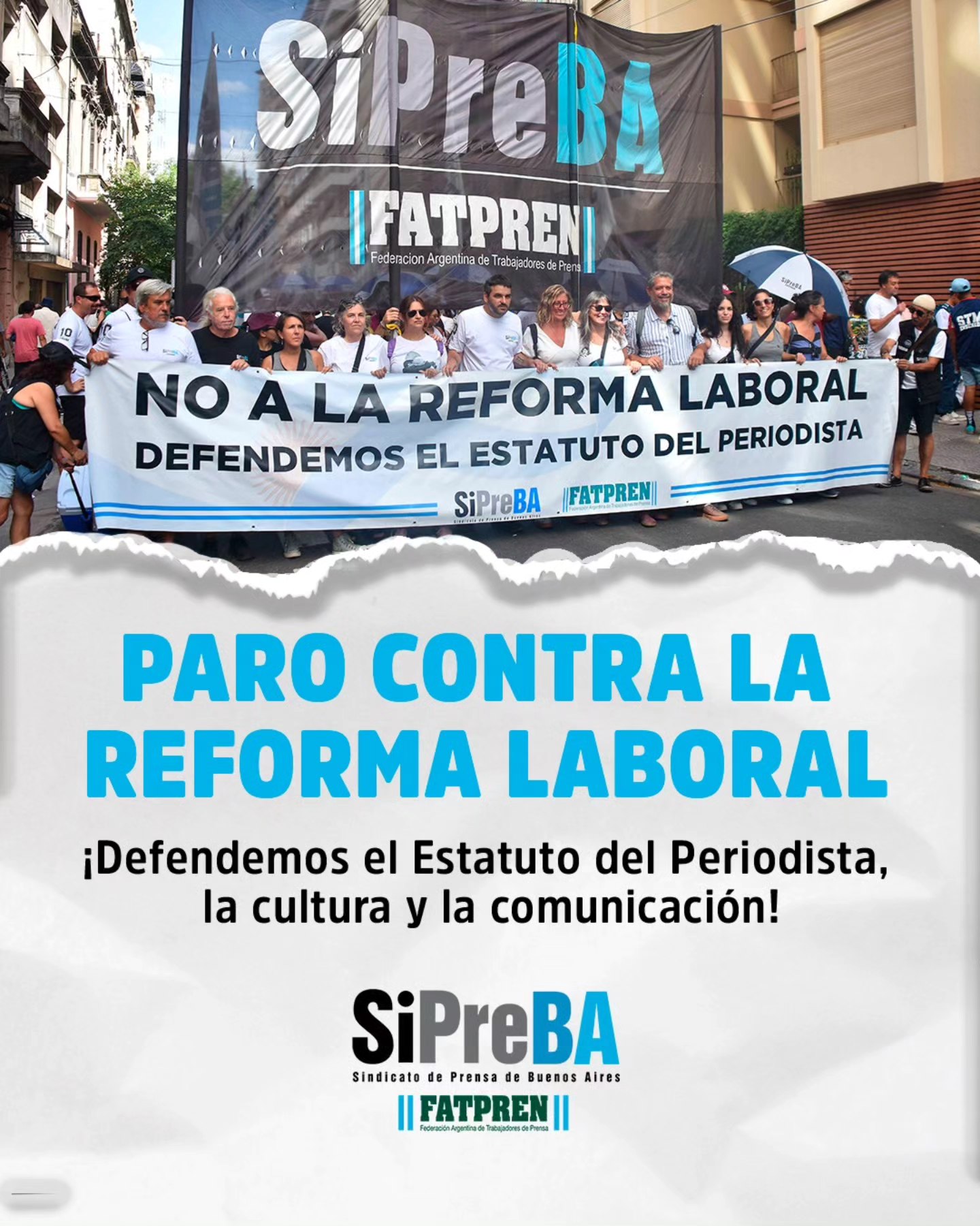 Buenos Aires, 18 de febrero de 2026 – El Sindicato de Prensa de Buenos Aires (SiPreBA), junto a la FATPREN, anunció su adhesión al paro general convocado por las centrales sindicales en rechazo a la reforma laboral.