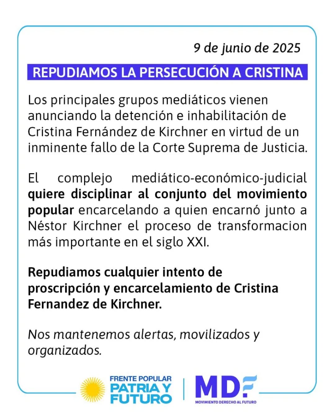 En el texto, la organización denunció que «el complejo mediático, económico, judicial quiere disciplinar al conjunto del movimiento nacional y popular encarcelando a quién encarnó junto a Néstor Kirchner el proceso de transformación más importante del siglo XXI». Además, manifestaron su rechazo a lo que consideran una persecución política: «Repudiamos la persecución a Cristina Fernández de Kirchner» y alertaron sobre el riesgo que implica para la democracia la posible proscripción judicial de una figura política central.