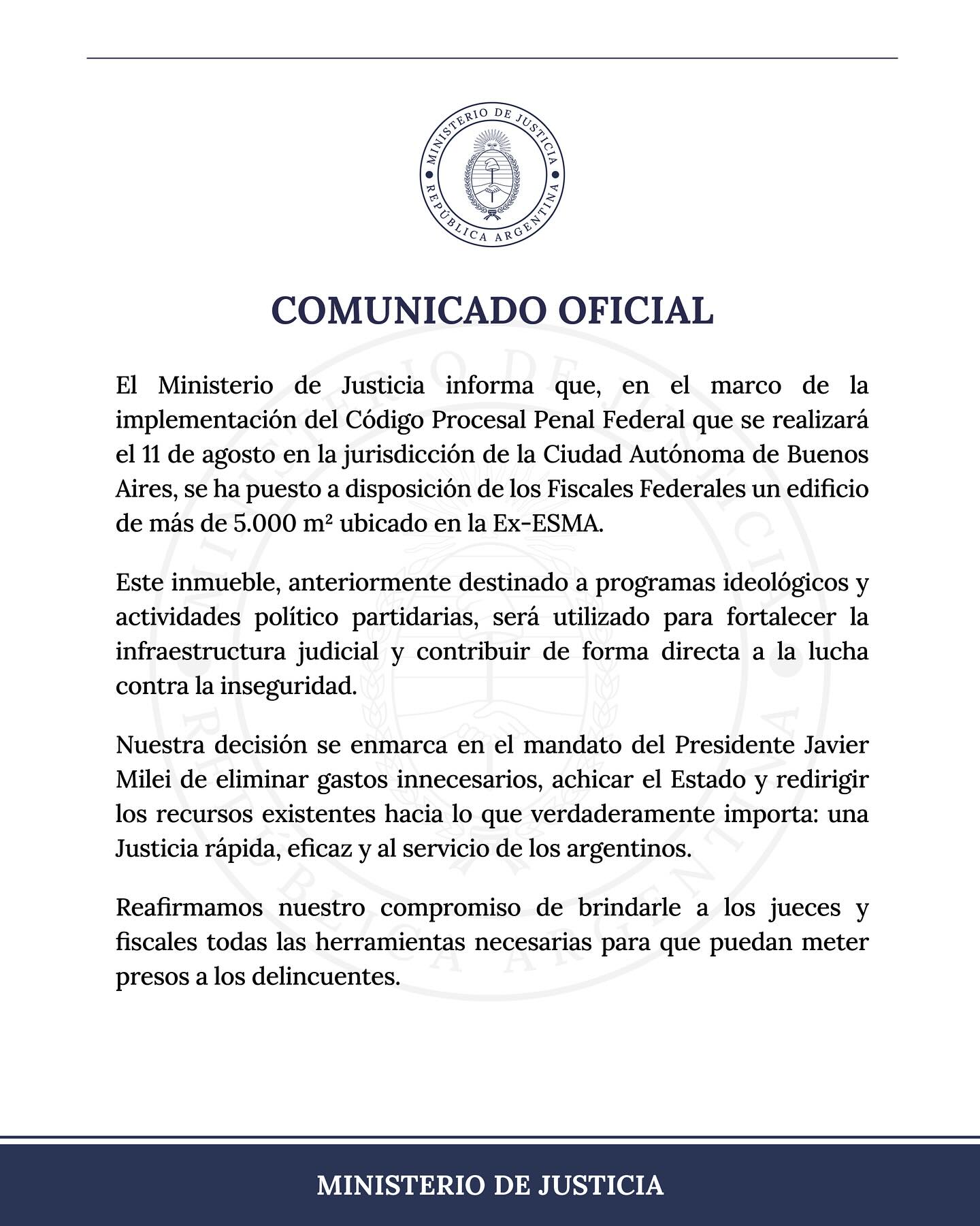 El Ministerio de Justicia de la Nación anunció oficialmente este jueves el traslado de varias fiscalías a un edificio ubicado en el predio de la ex-ESMA, un sitio emblemático de la memoria donde funcionó uno de los mayores centros clandestinos de detención, tortura y desaparición de personas durante la última dictadura militar argentina.