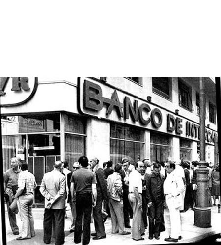 Simbolizó el colapso financiero de la dictadura: corrupción, especulación y devaluaciones arrasaron el «modelo». En dos años, cayeron 71 bancos más, con el peso devaluado 40.000%.