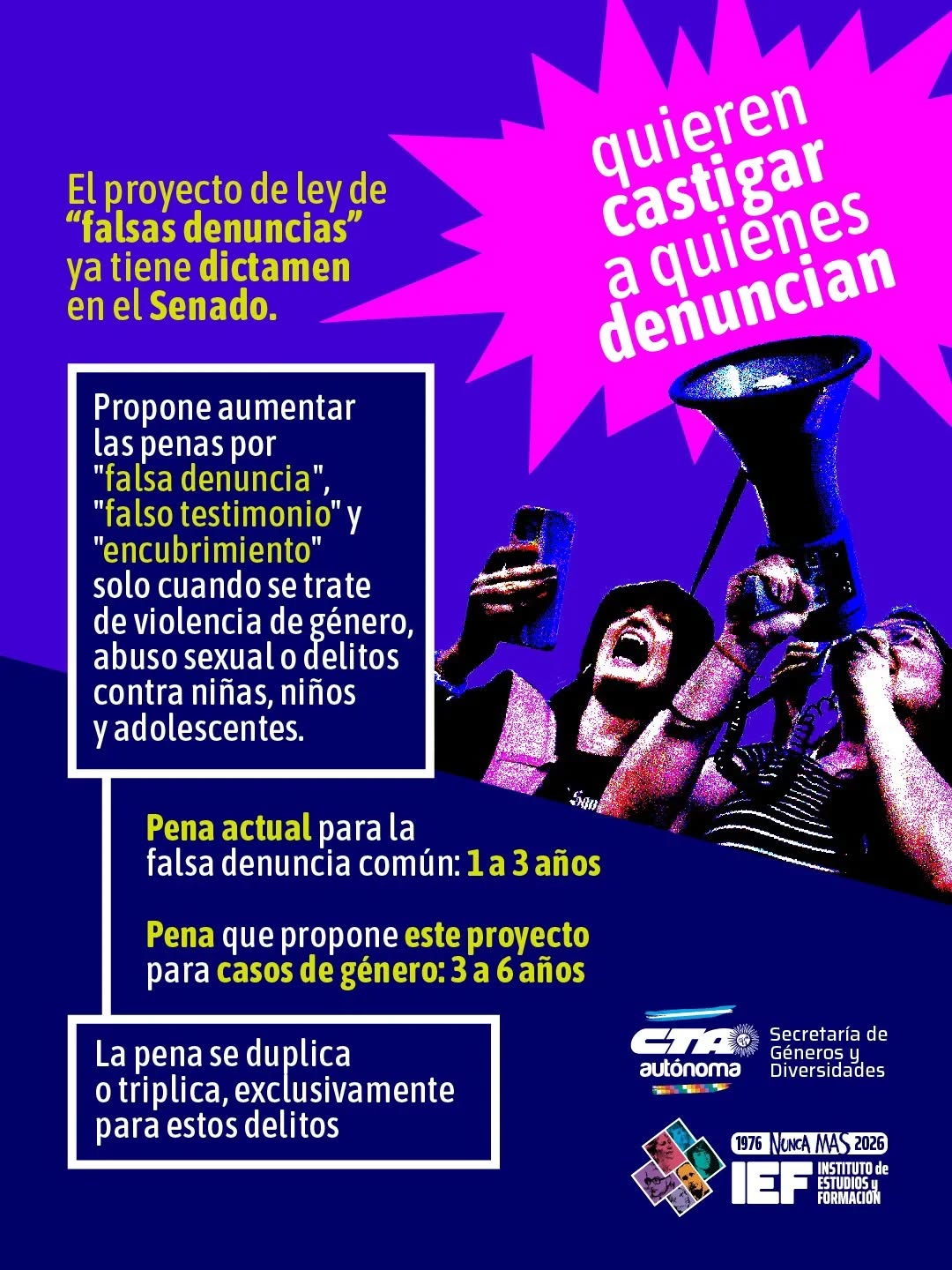La CTA Autónoma convocó a rechazar la iniciativa bajo el hashtag #NoAlProyectoDeFalsasDenuncias, instando a legisladores y sociedad a movilizarse contra lo que definen como un retroceso en la lucha contra la violencia.