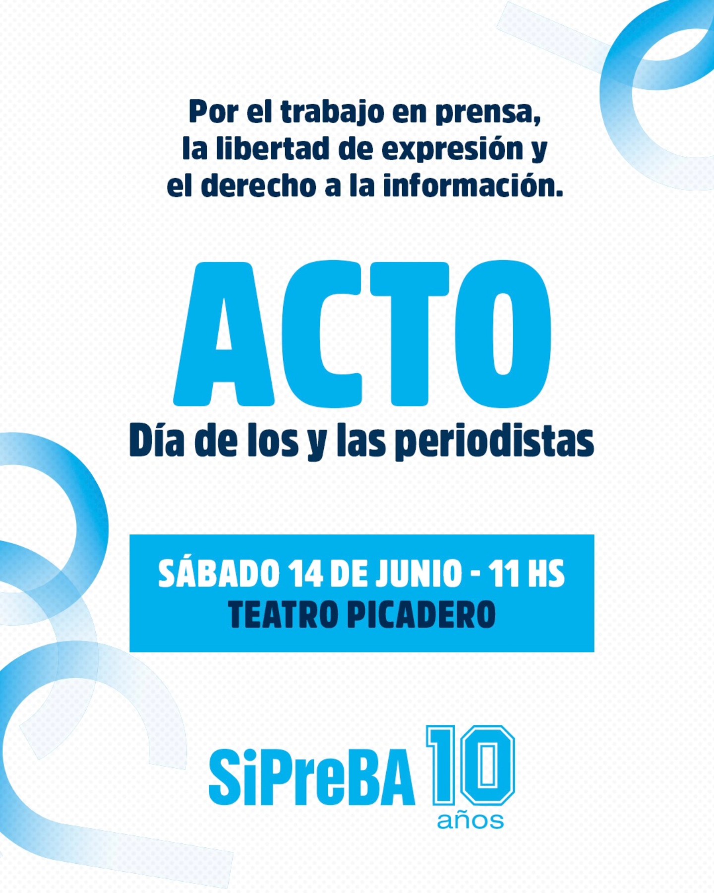 El Sindicato de Prensa de Buenos Aires (SIPREBA) realizará un acto conmemorativo por sus 10 años bajo el lema «¡Por el periodismo y su rol para la democracia!».