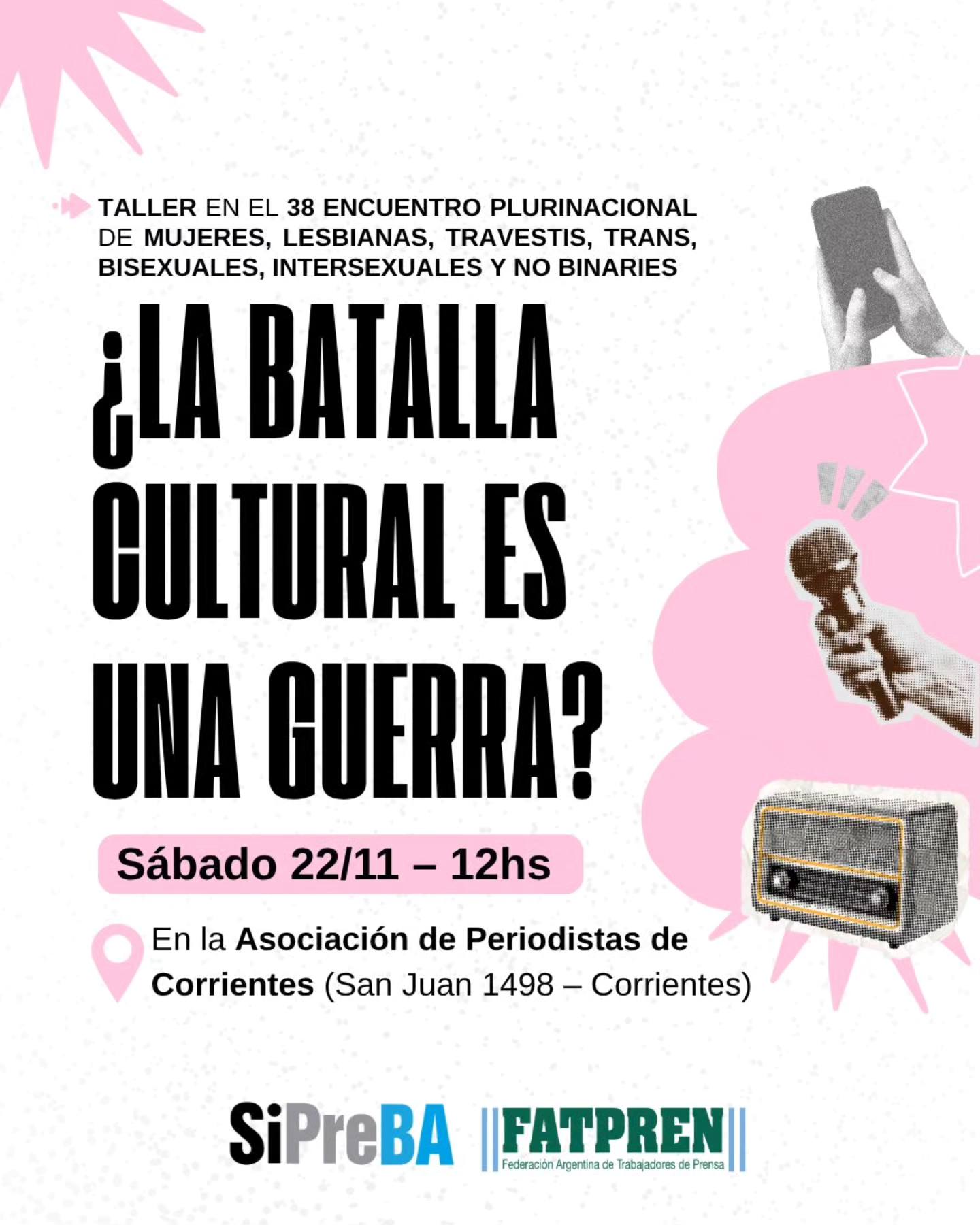 En el marco de @38encuentro.pluri, el Sindicato de Prensa de Buenos Aires (SIPREBA) invita a un taller presencial para analizar y desarticular las narrativas que operan en los medios de comunicación y que atraviesan a la sociedad argentina. El encuentro tendrá lugar el próximo sábado 22 de noviembre a las 12 horas en la Asociación de Periodistas de Corrientes, ubicada en la calle San Juan 1498.