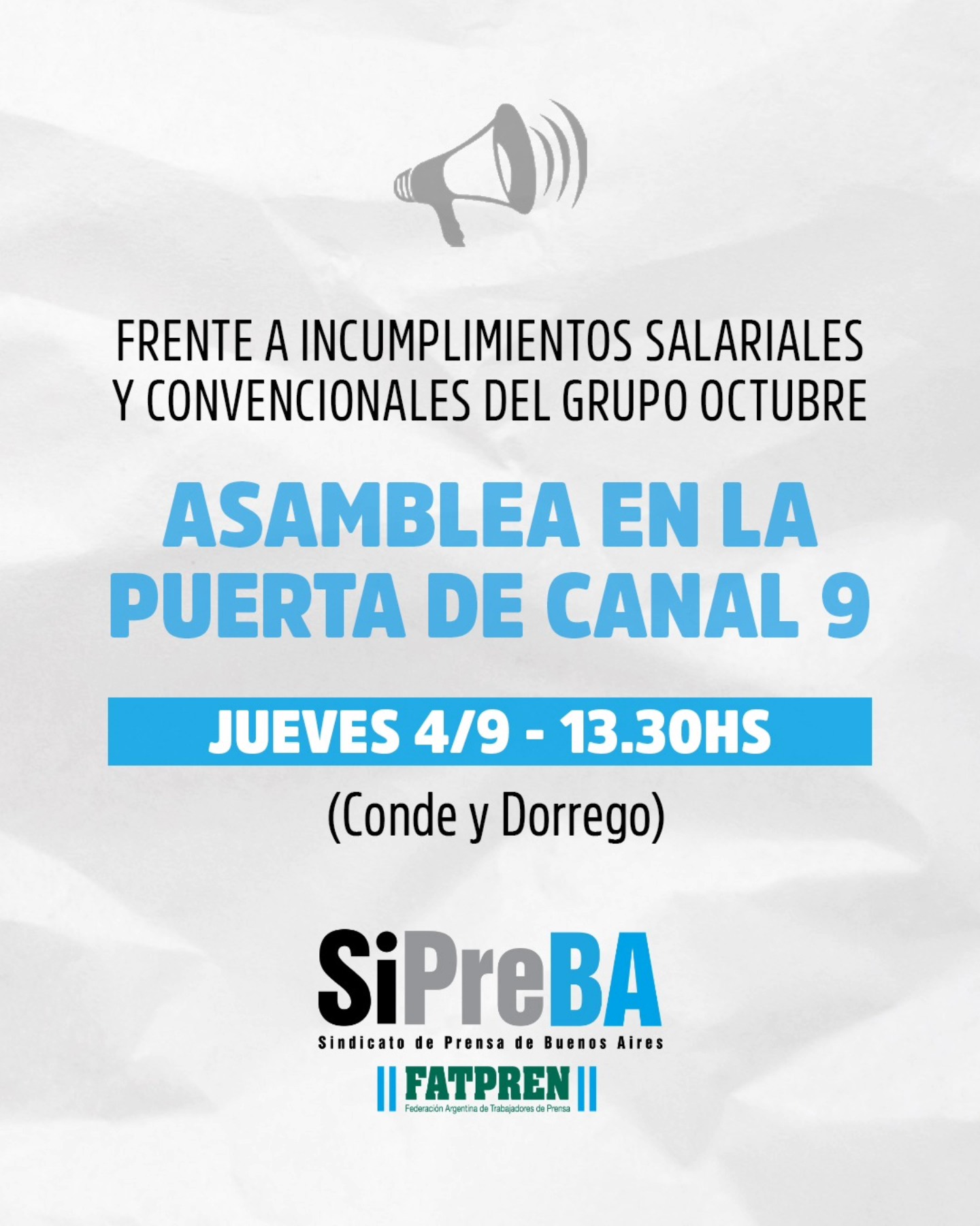 El Sindicato de Prensa de Buenos Aires (SIPREBA) denunció públicamente que el Grupo Octubre está incumpliendo las paritarias acordadas en los medios que administra: Canal 9, Página 12 y Radio Continental. Además, el grupo habría acumulado importantes deudas salariales con sus trabajadores.