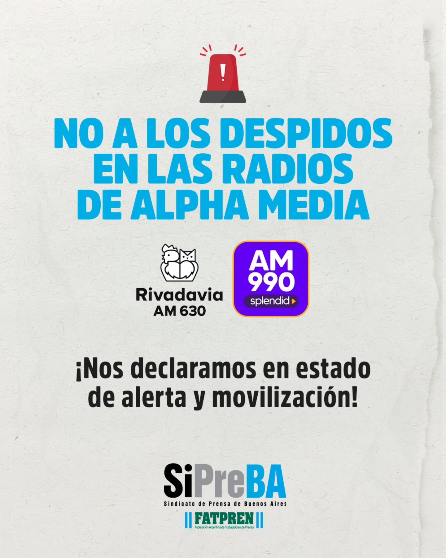 Buenos Aires, 29 de abril de 2026 – El Sindicato de Prensa de Buenos Aires (SIPREBA) expresó un fuerte repudio a los despidos de más de 20 trabajadores en las radios Rivadavia 630 y Splendid AM 990, ambas pertenecientes al grupo Alpha Media. Este ajuste se suma a los 15 cesantías registradas el mes pasado en el mismo conglomerado empresarial, en medio de una situación crítica en la agencia Noticias Argentinas (NA).