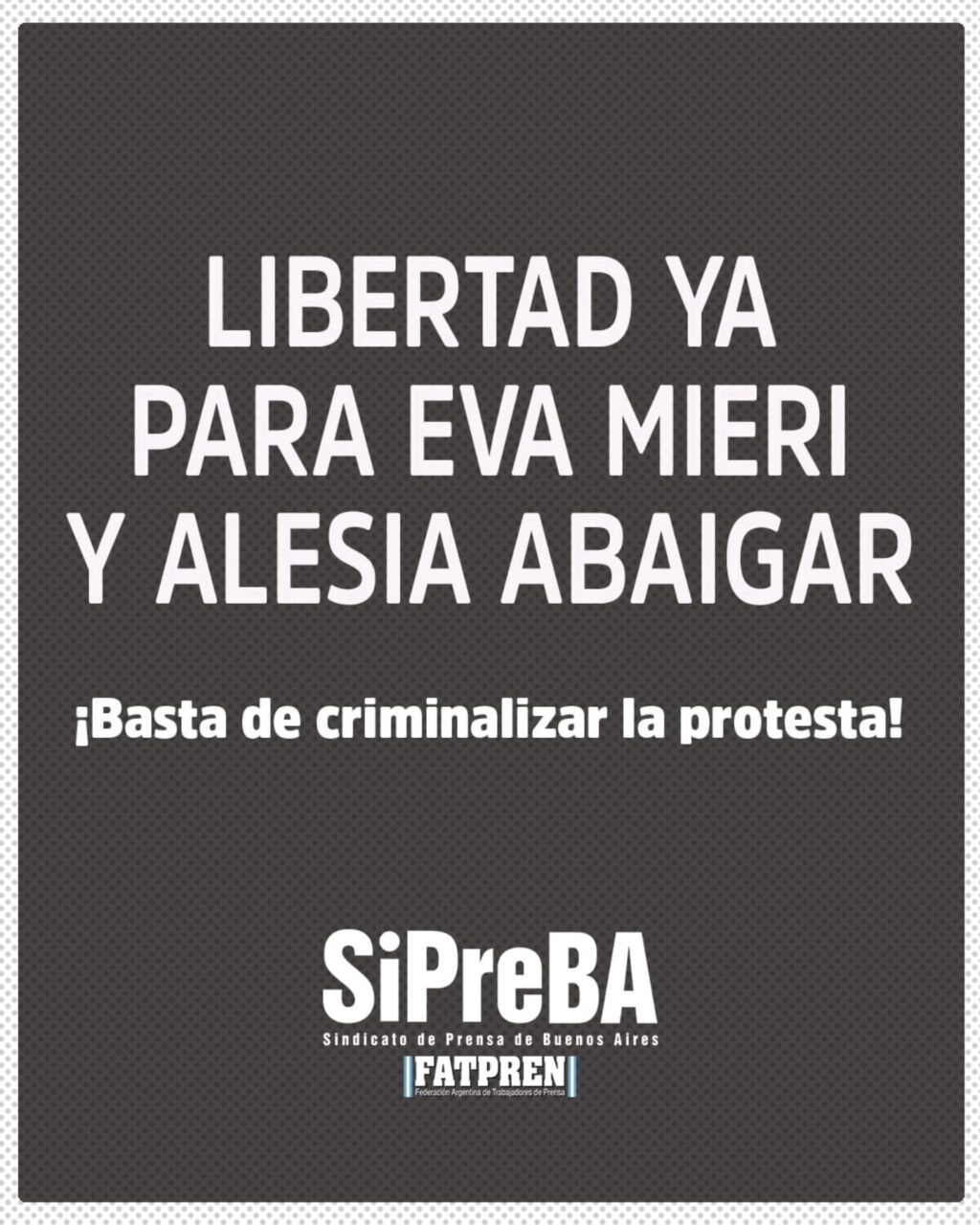 El comunicado, difundido a través de las redes sociales del sindicato, exige la liberación urgente de Eva Mieri, quien fue trasladada al penal federal de Ezeiza, y de Alesia Abaigar, actualmente bajo prisión domiciliaria. Según SIPREBA, ambas están acusadas de hechos que, en todo caso, «sólo serían una contravención».