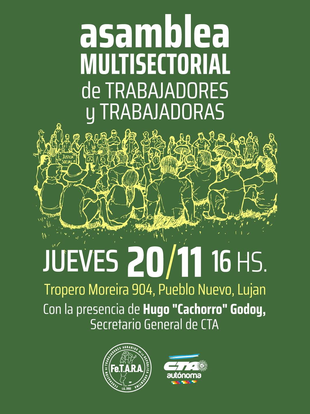 Este jueves 20 de noviembre, a partir de las 16 horas, se llevará a cabo una Asamblea Multisectorial de Trabajadores y Trabajadoras en Tropero Moreira 904, Pueblo Nuevo, Luján. La convocatoria es impulsada por la CTA Autónoma y busca enfrentar el proyecto de reforma laboral promovido por el gobierno de Javier Milei.