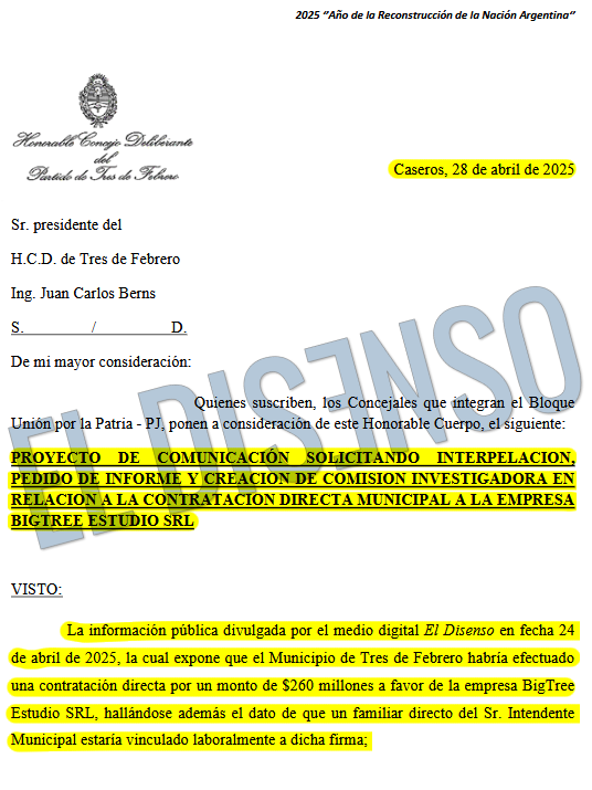 Un pedido formal para interpelar al intendente Diego Valenzuela (La Libertad Avanza) ingresó el 28 de abril al Concejo Deliberante de Tres de Febrero, luego de que El Disenso revelara contrataciones directas por $260 millones a una empresa vinculada a su hijo. La solicitud exige que el jefe comunal explique las licitaciones y posibles conflictos de interés.
