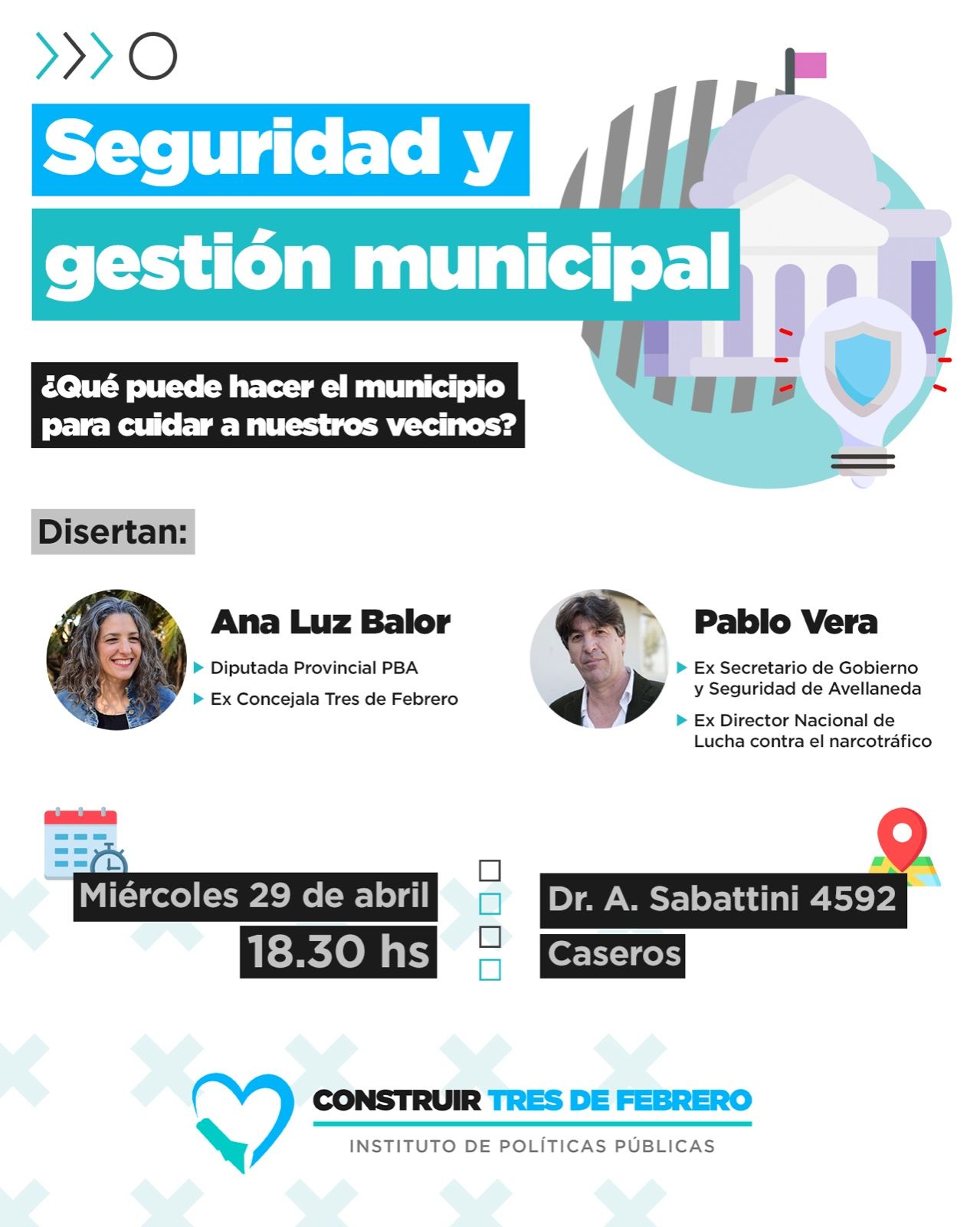 La actividad contará con las disertaciones de Ana Luz Balor, diputada provincial y ex concejala de Tres de Febrero, y Pablo Vera, ex secretario de Gobierno y Seguridad de Avellaneda y ex director nacional de Lucha contra el Narcotráfico.