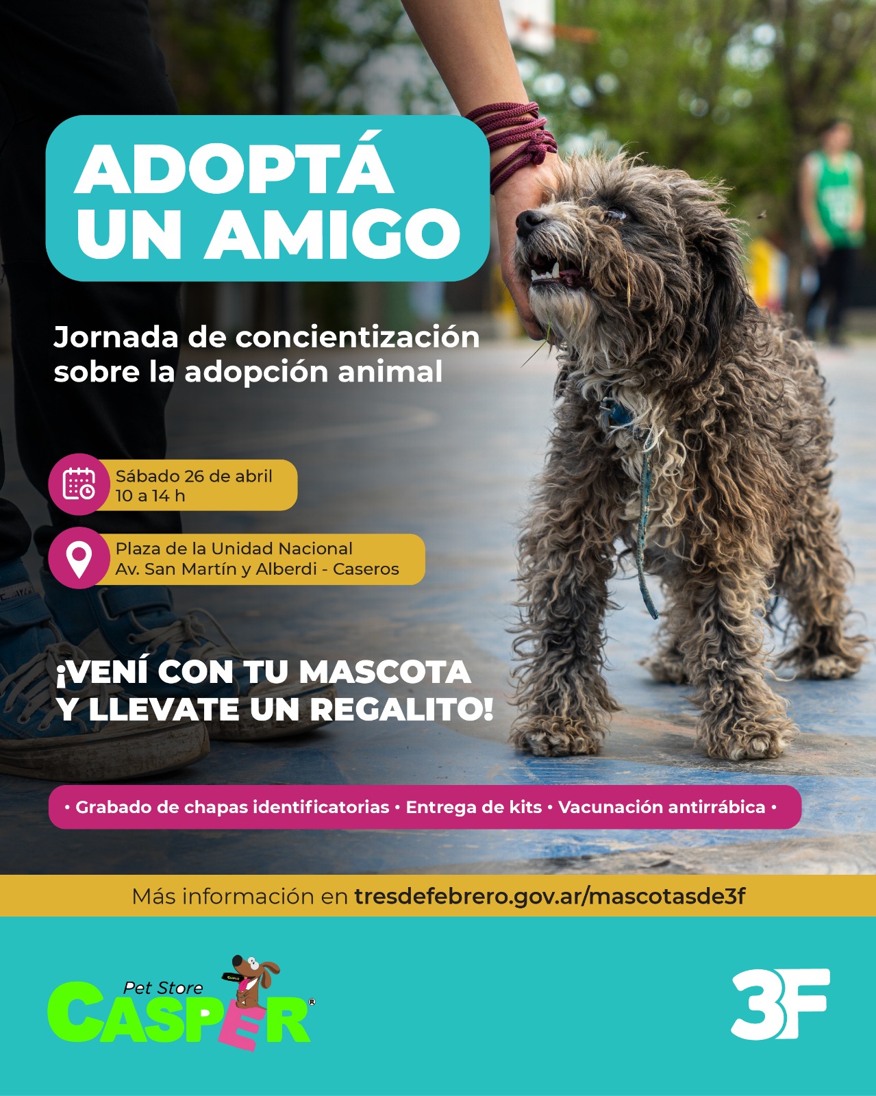 La Municipalidad de Tres de Febrero organiza la jornada «Un nuevo amigo te está esperando» este sábado 26 de abril, de 10 a 14 horas, en la Plaza de la Unidad Nacional (Av. San Martín y Alberdi) en Caseros.