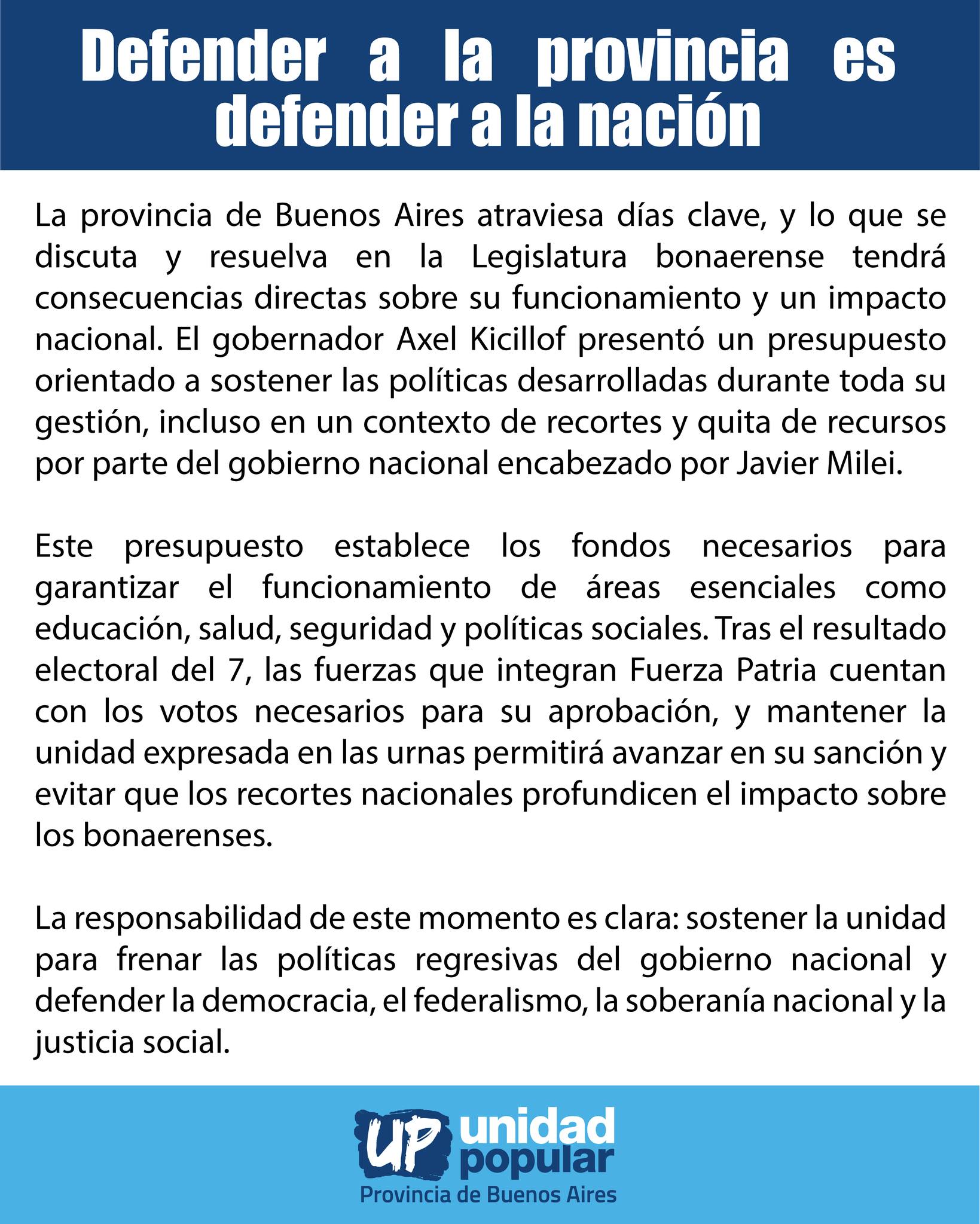 UNIDAD POPULAR LLAMA A DEFENDER EL PRESUPUESTO 2026 PARA LA PROVINCIA DE BUENOS AIRES
