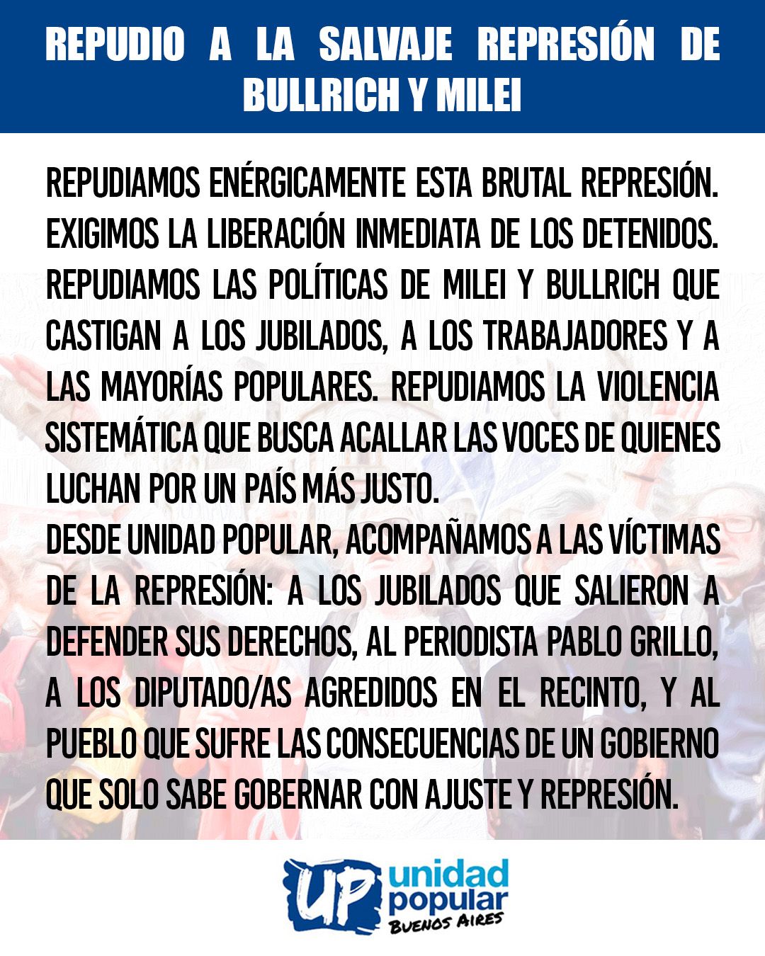 La declaración de la Unidad Popular expresa su enérgico rechazo a lo que consideran una «brutal represión» y critica las políticas del presidente Javier Milei y de Bullrich, que a su juicio castigan a jubilados y trabajadores. «Repudiamos la violencia sistemática que busca acallar las voces de quienes luchan por un país más justo», afirmaron. La organización también hizo hincapié en que esta represión es parte de una estrategia más amplia que busca implementar un ajuste sobre los derechos laborales y previsionales.