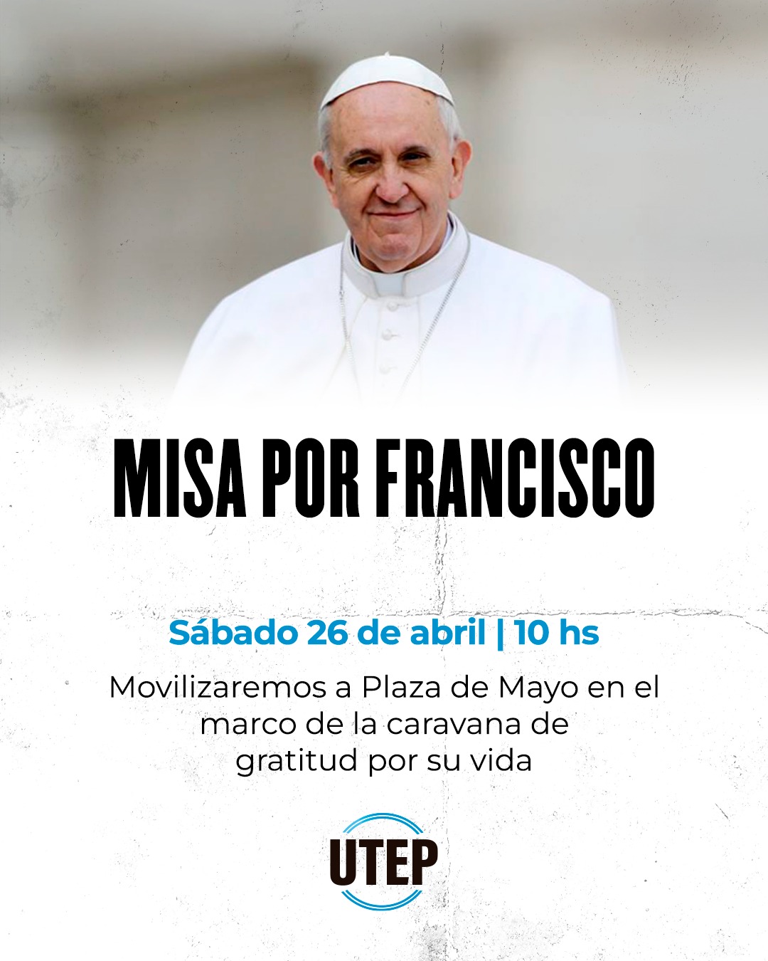 La Unión de Trabajadores y Trabajadoras de la Economía Popular (UTEP) convocó a una movilización este sábado 26 de abril a las 10 horas en Plaza de Mayo para acompañar la misa por el eterno descanso del Papa Francisco, fallecido recientemente.